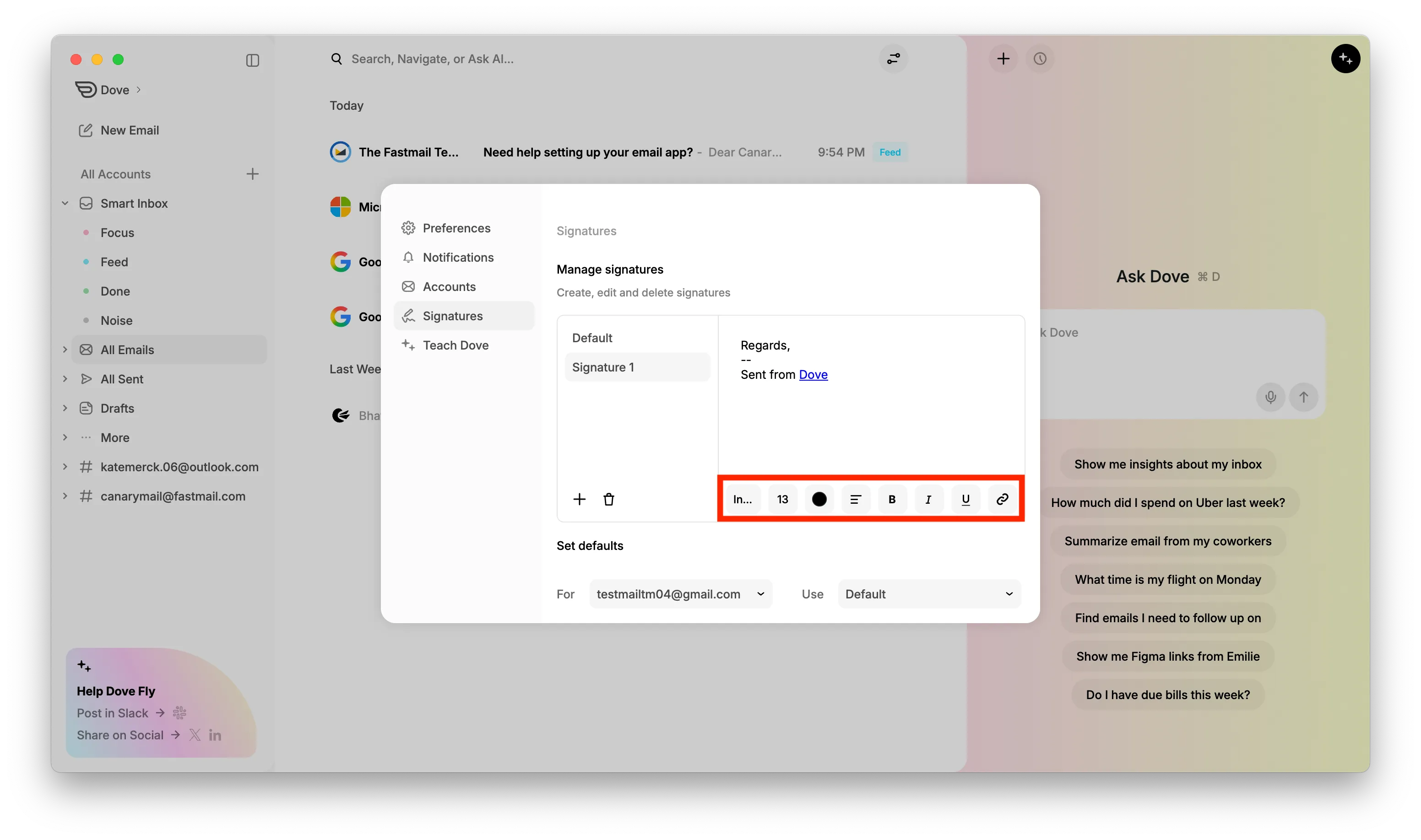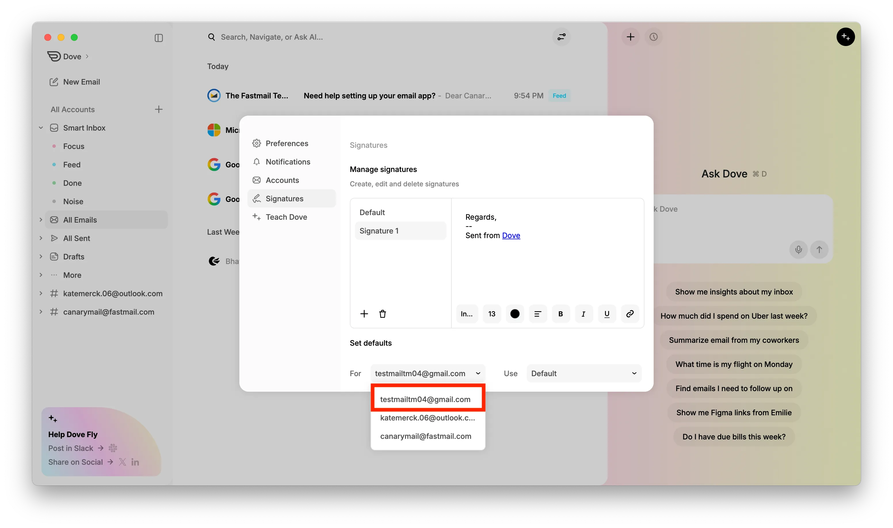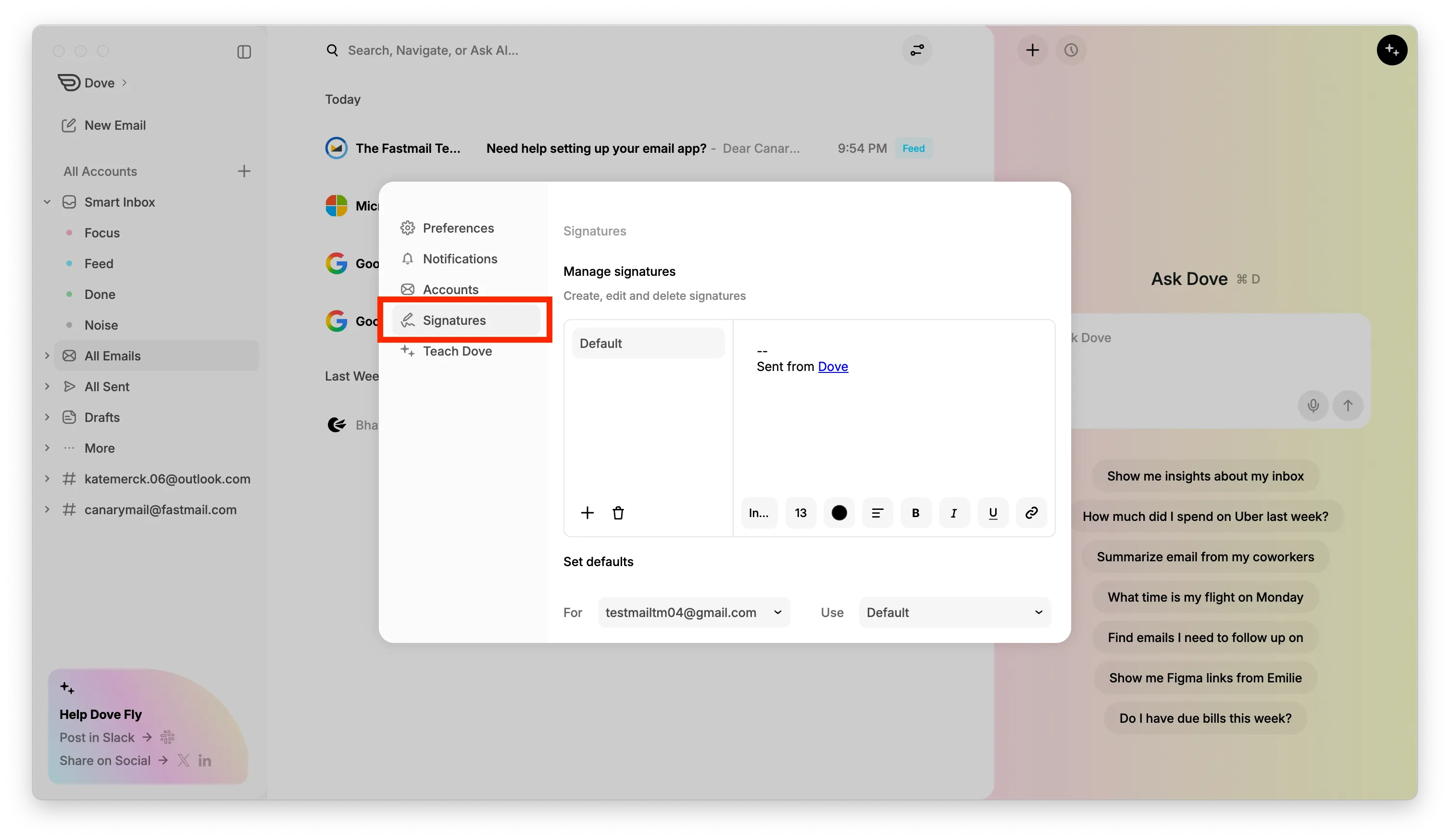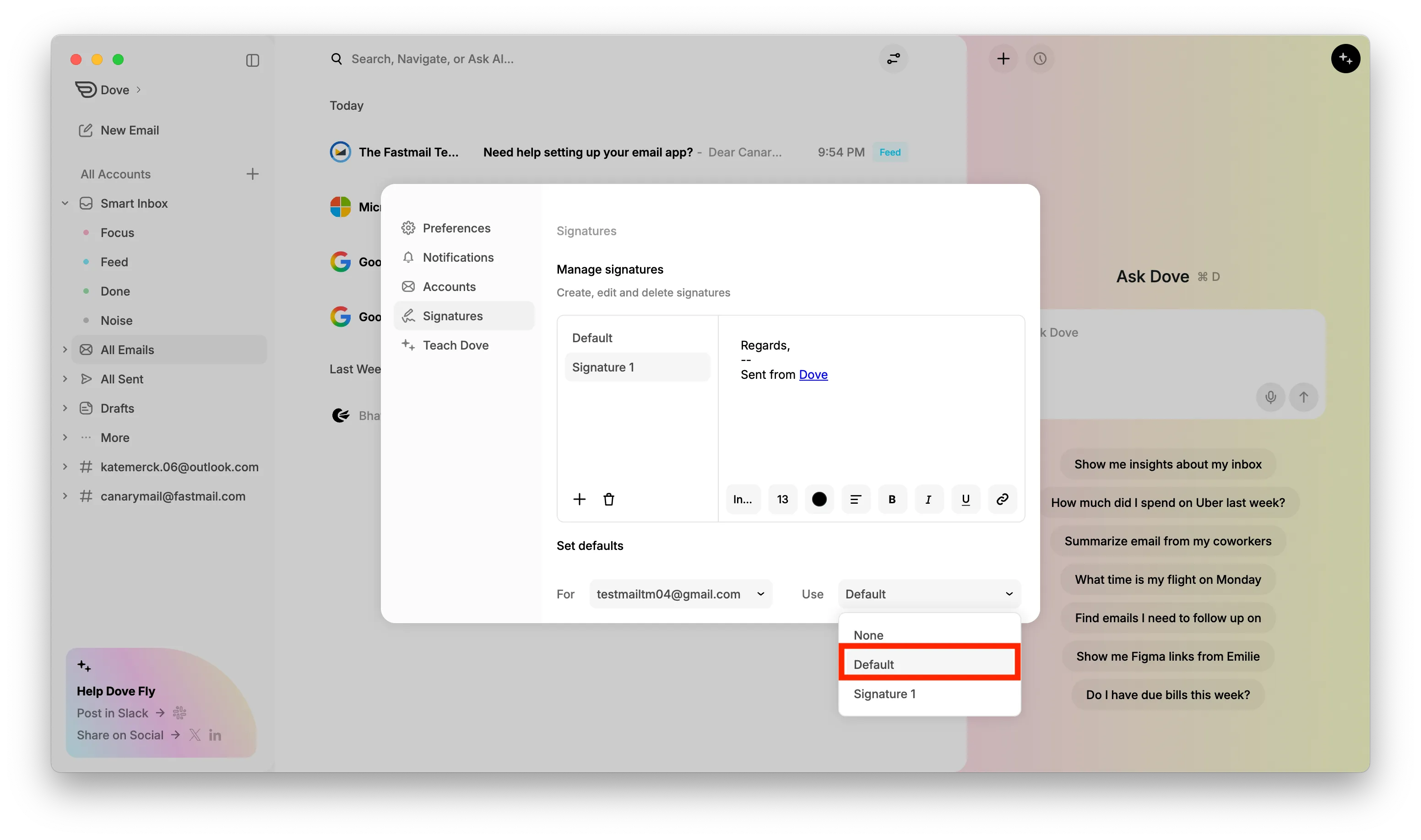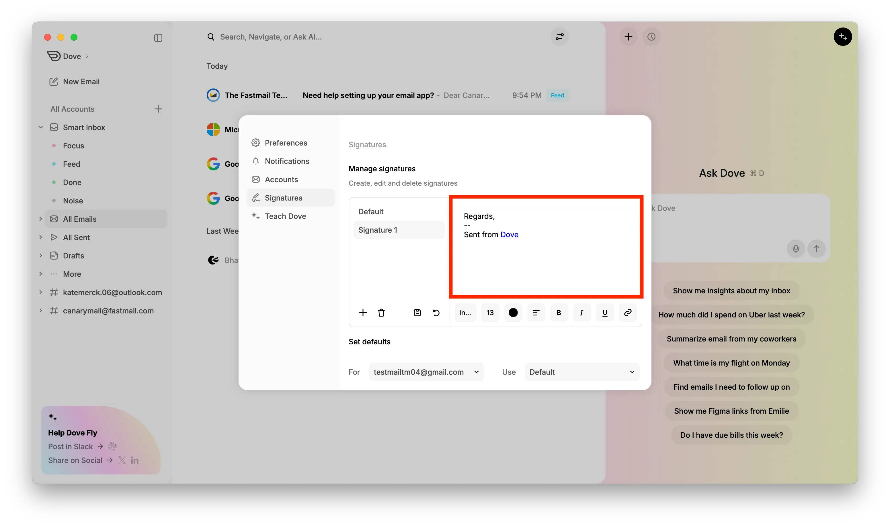 Add a personal sign-off to every outgoing message. Dove lets you configure a signature per account so your emails always end the way you want.