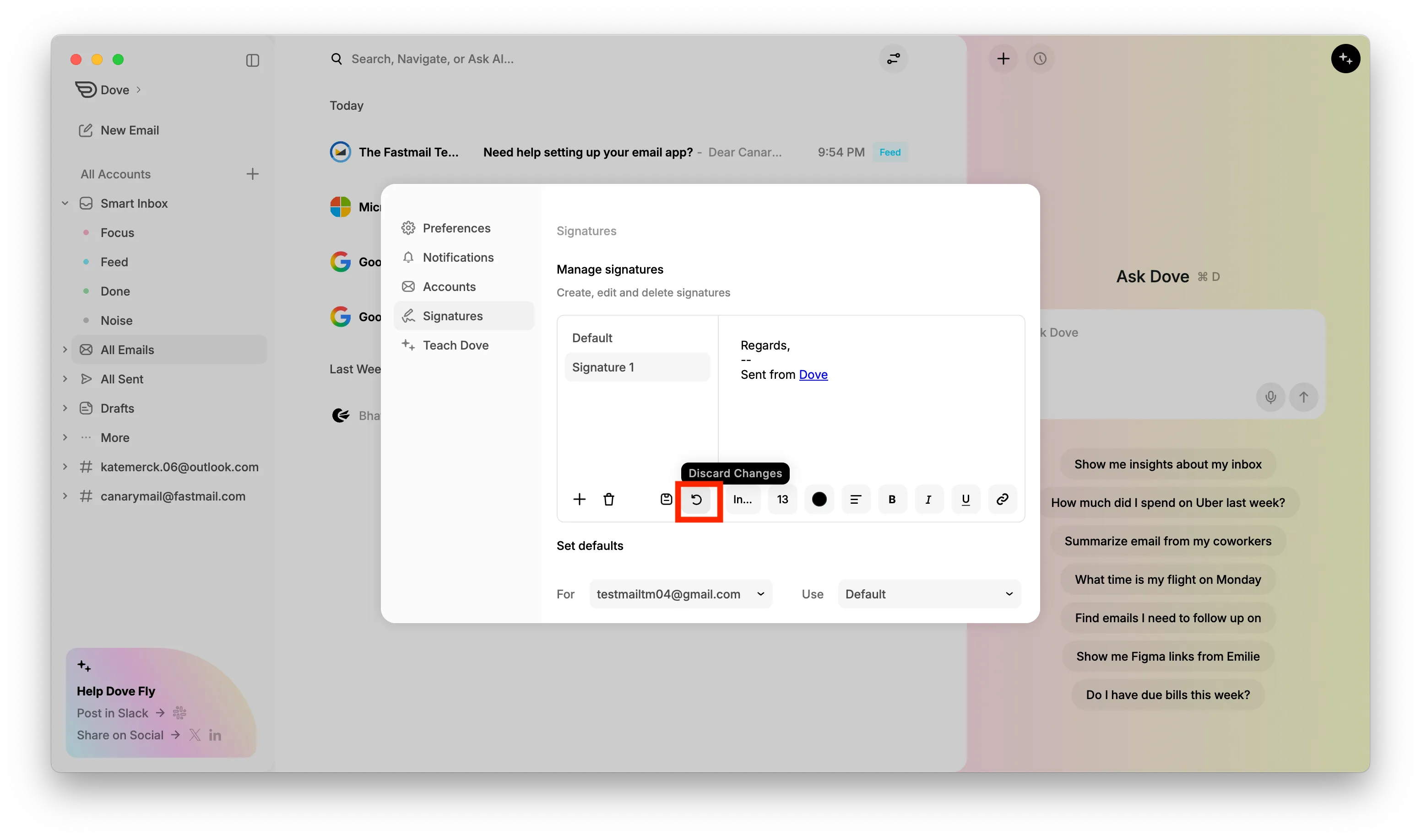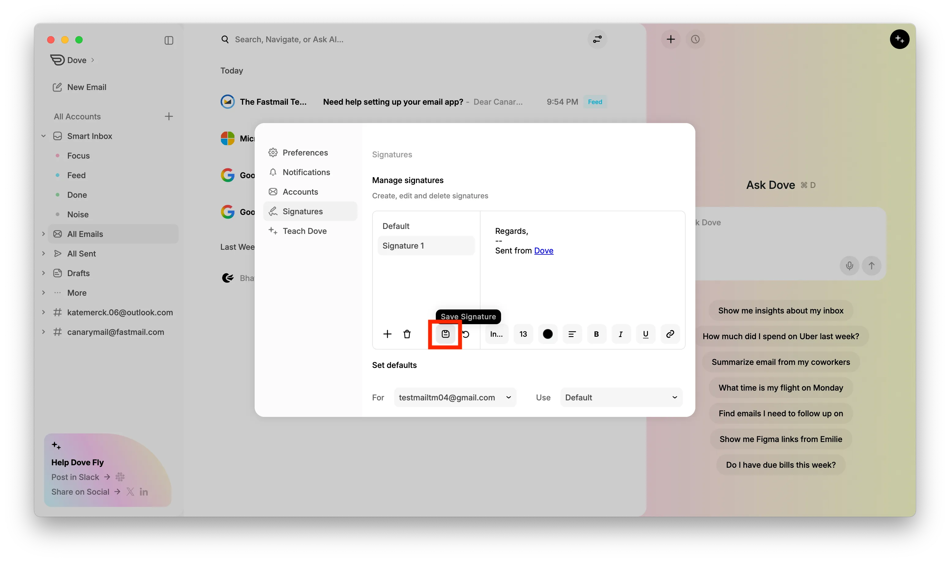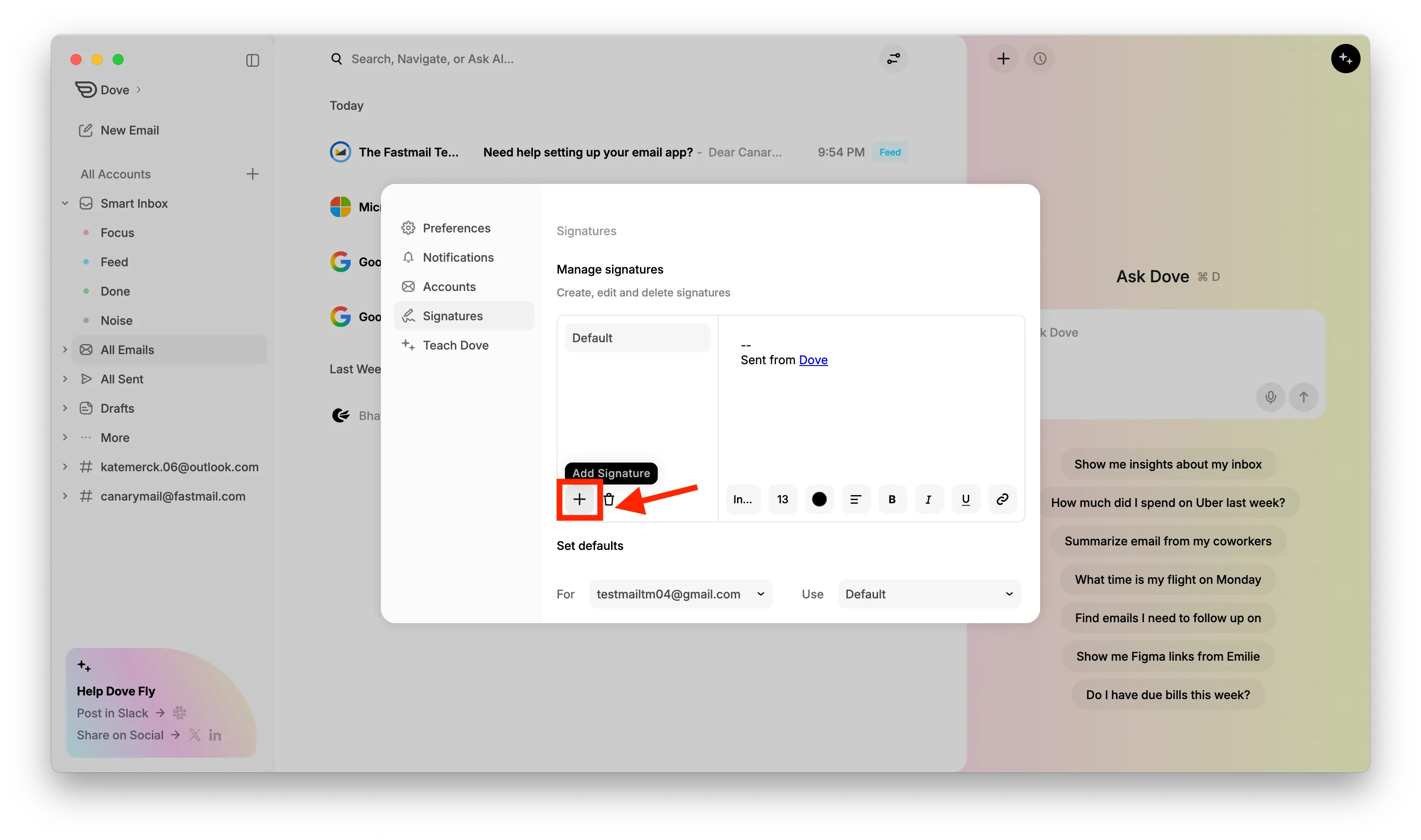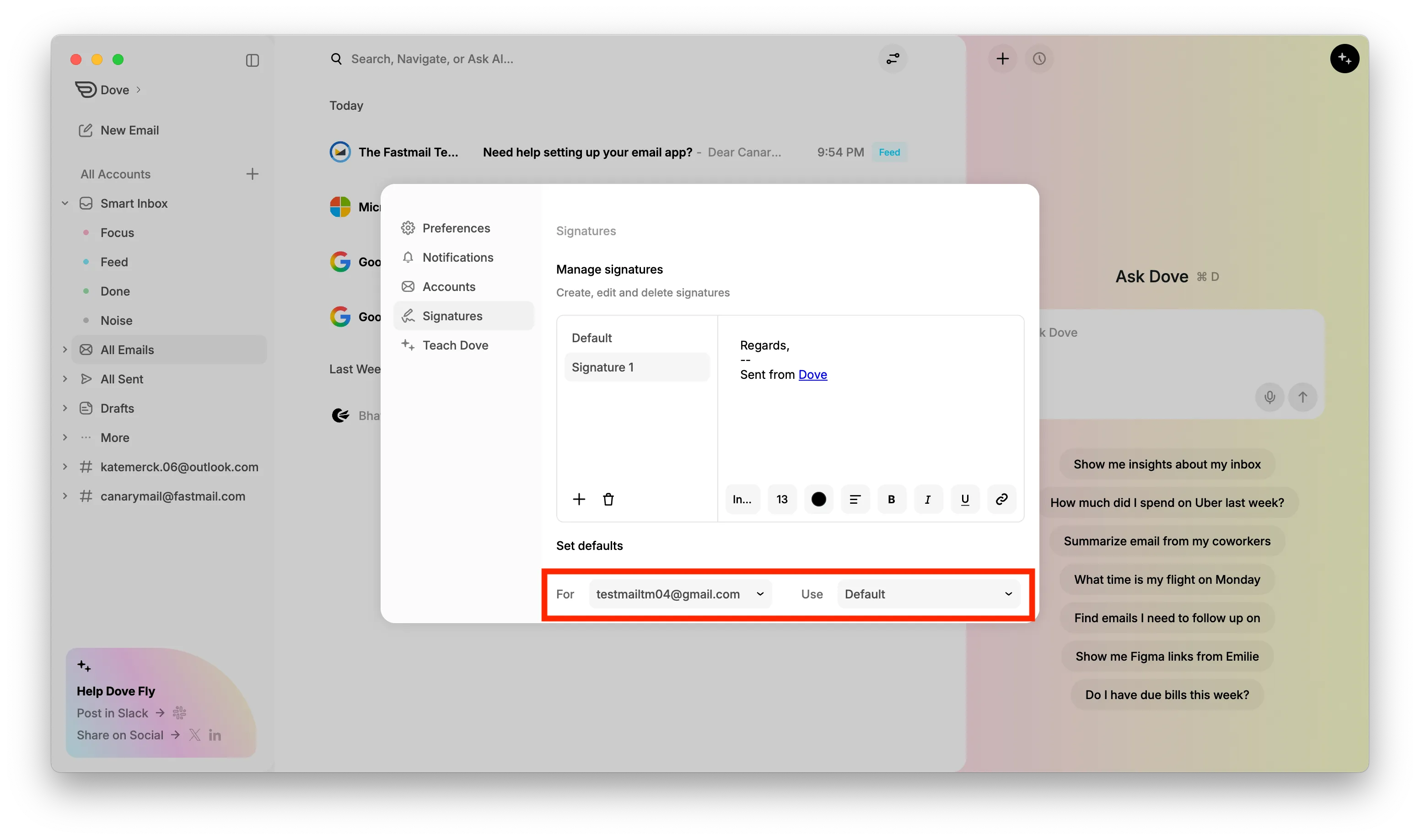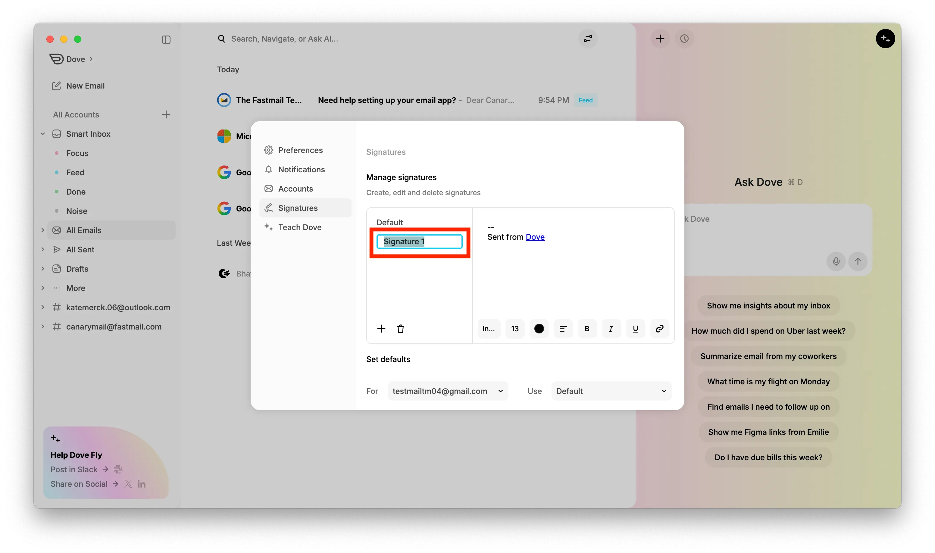 Add a personal sign-off to every outgoing message. Dove lets you configure a signature per account so your emails always end the way you want.